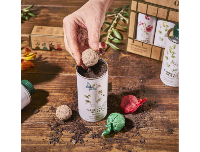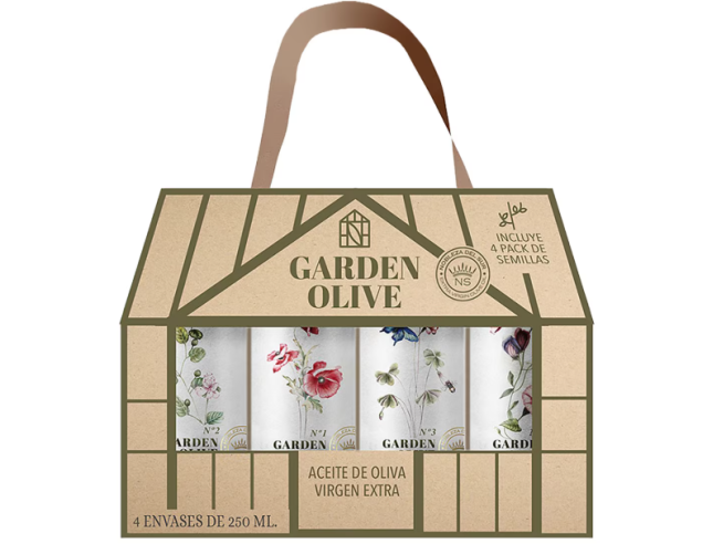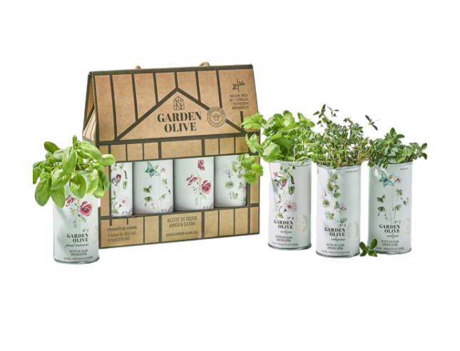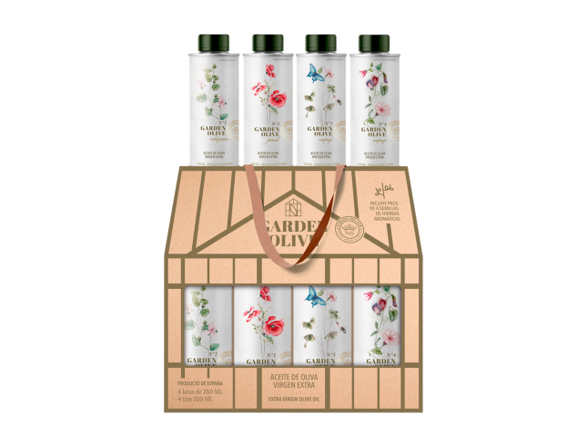 AOVE Garden Olive pack 4 unidades. 250 ml c/u El pack de 4 unidades de AOVE Garden Olive cuenta con una particularidad muy especial y es que incluye un estuche con cuatro semillas de hierbas aromáticas para que, cuando termines de utilizar el aceite, puedas usar su envase para plantarlas...
