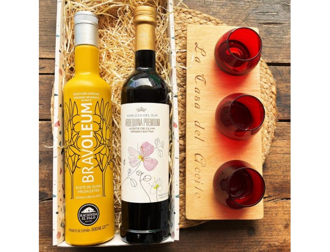 Esta estupenda caja regalo con aceite de oliva de calidad premium está formada por: