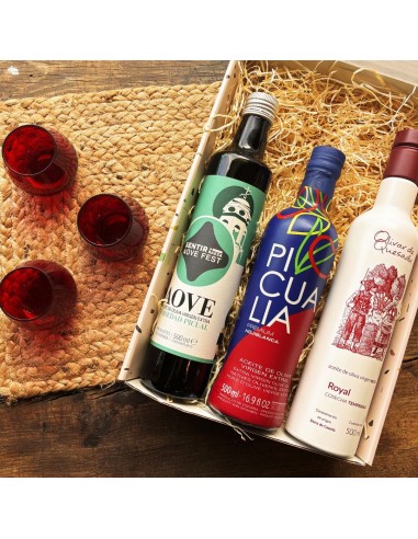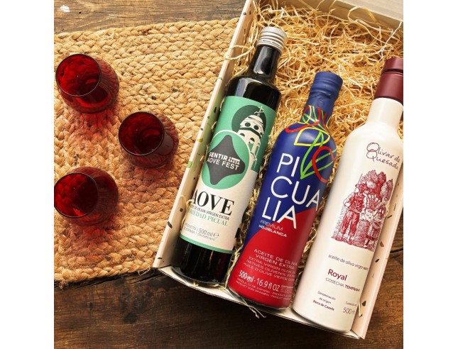 Esta estupenda caja regalo con aceite de oliva de calidad premium está formada por: