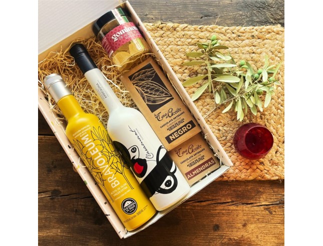 Esta estupenda caja regalo con aceite de oliva de calidad premium está formada por: