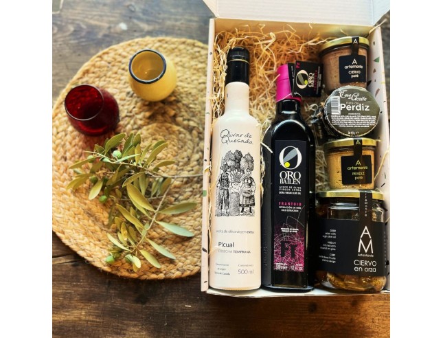 Estuches Regalo Olivar de Quesada Picual + Oro de Bailén Frantoio + 2 Paté de Perdiz/ Ciervo +Ciervo en Orza