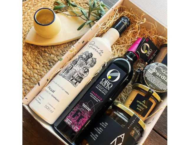 Esta estupenda caja regalo con aceite de oliva de calidad premium está formada por: