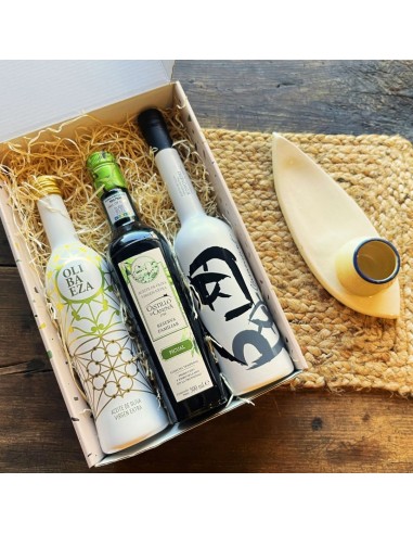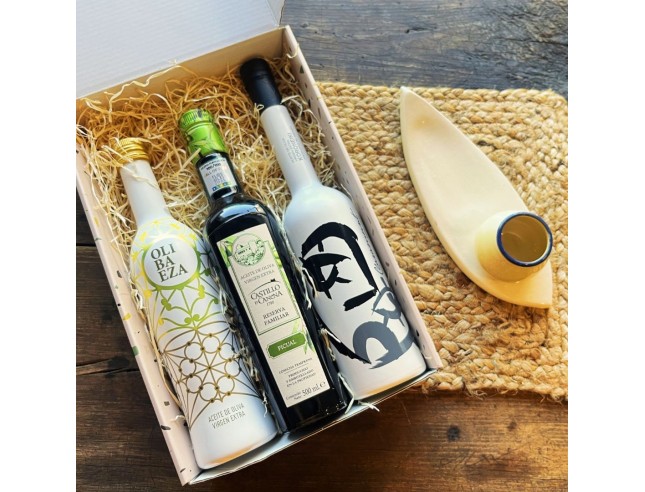 Esta estupenda caja regalo con aceite de oliva de calidad premium está formada por:
