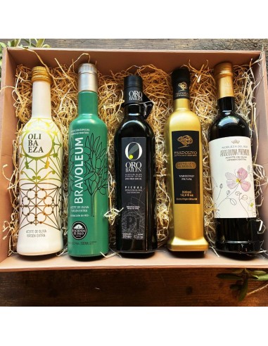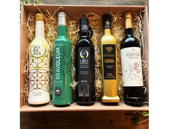 Esta estupenda caja regalo con aceite de oliva de calidad premium está formada por: