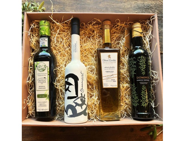 Esta estupenda caja regalo con aceite de oliva de calidad premium está formada por: