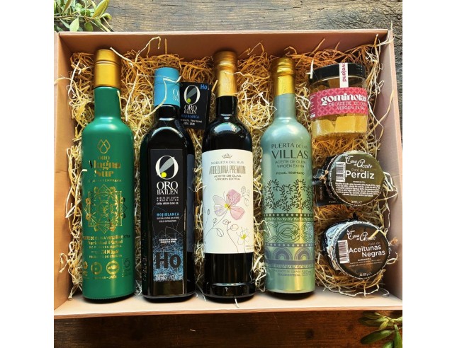 Esta estupenda caja regalo con aceite de oliva de calidad premium está formada por: