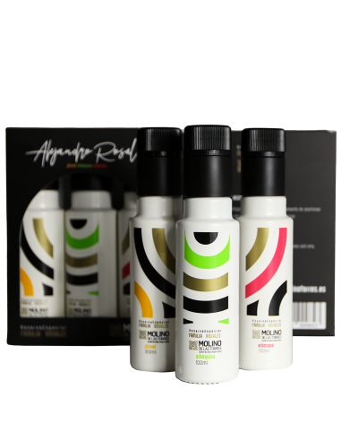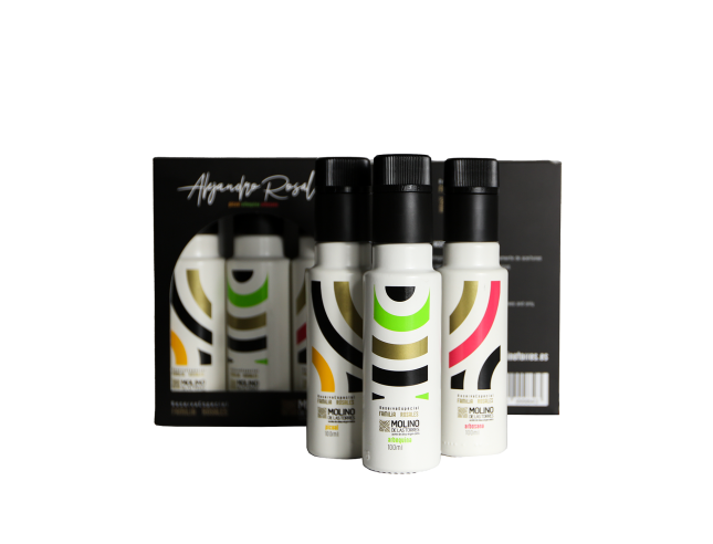 Nuestra selección de 3 botellas de 100ml (PICUAL, ARBEQUINA Y ARBOSANA) de nuestros mejores aceites de oliva en un solo pack.